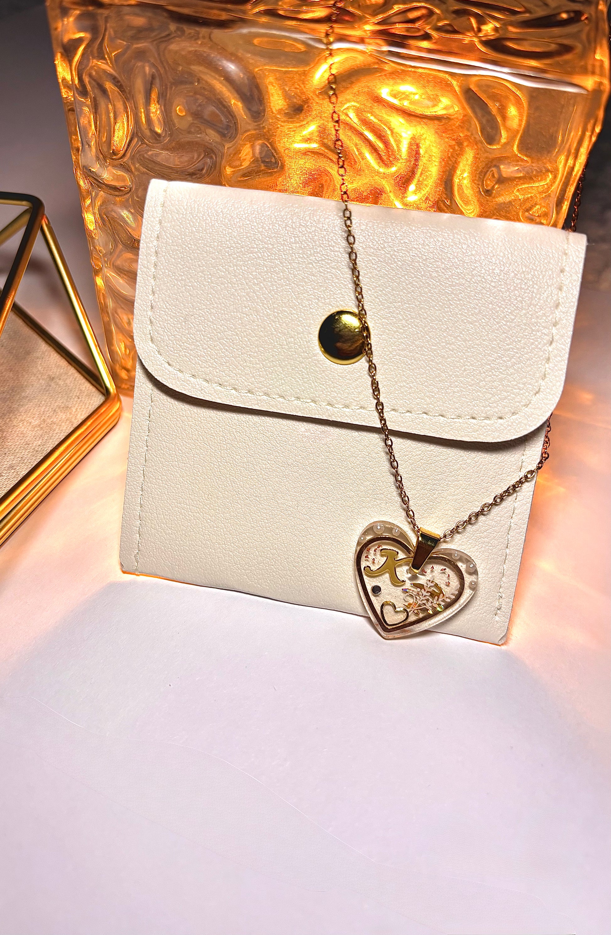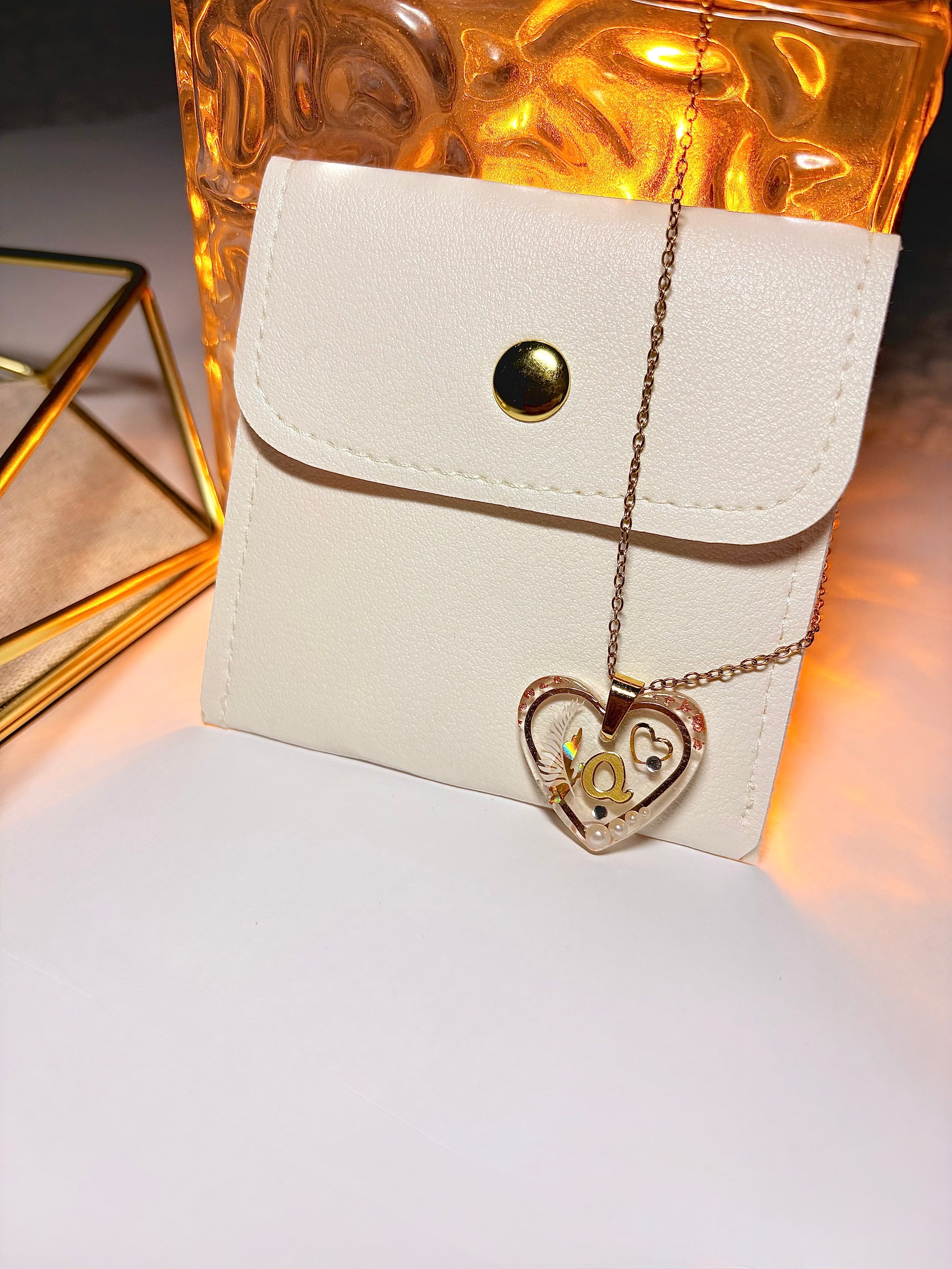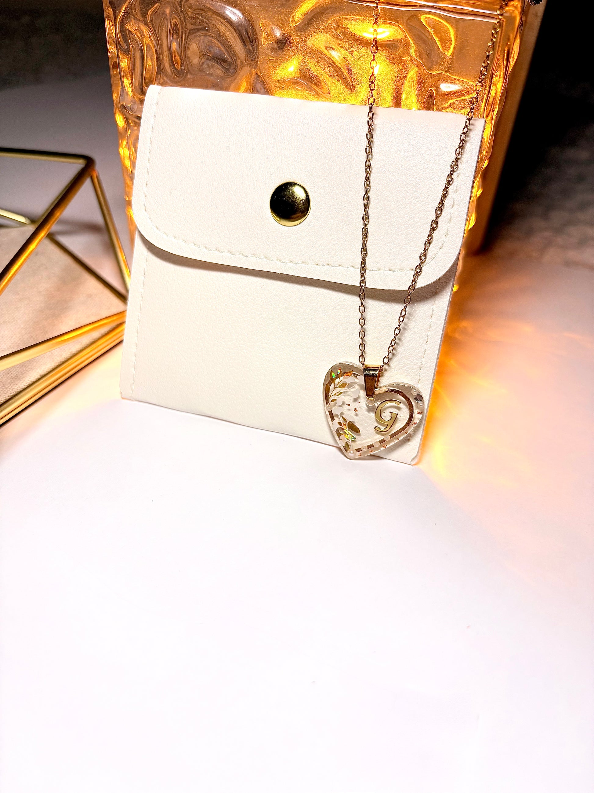 Collier délicat composé d’une chaîne fine dorée et d’un pendentif cœur translucide, orné d’une initiale dorée et de détails délicats incrustés à la main. Chaque pièce capte la lumière avec douceur, révélant un bijou à la fois raffiné et profondément personnel.