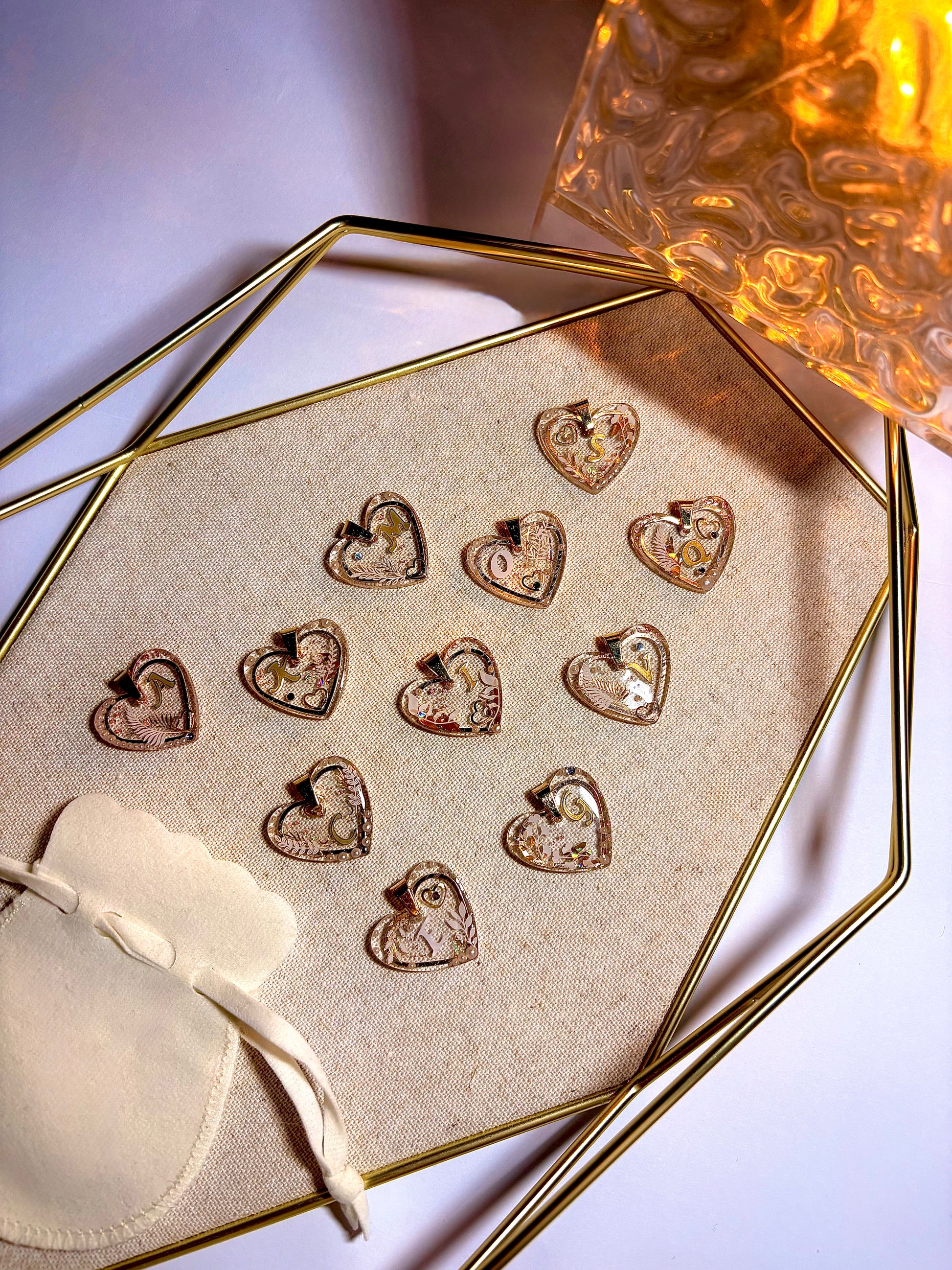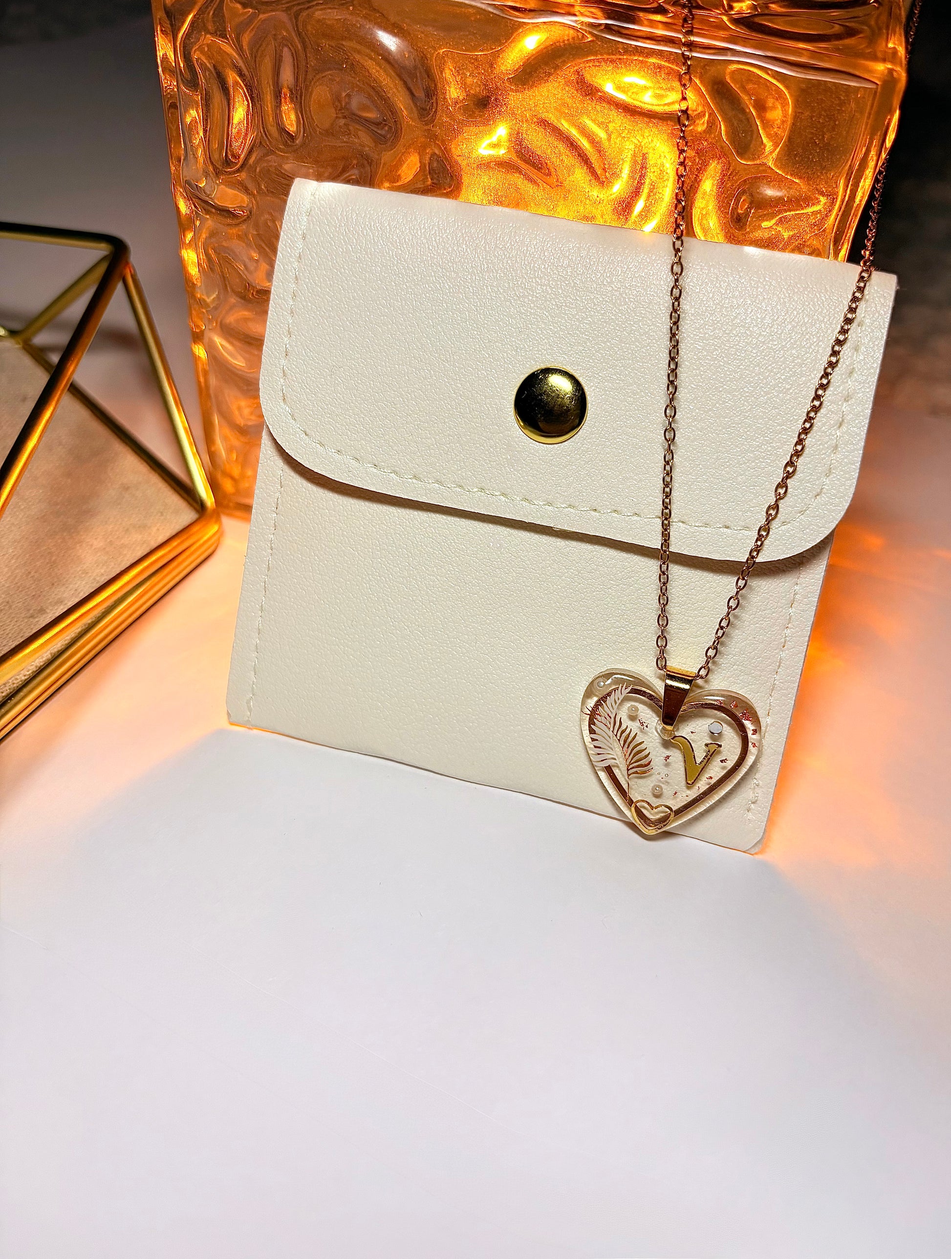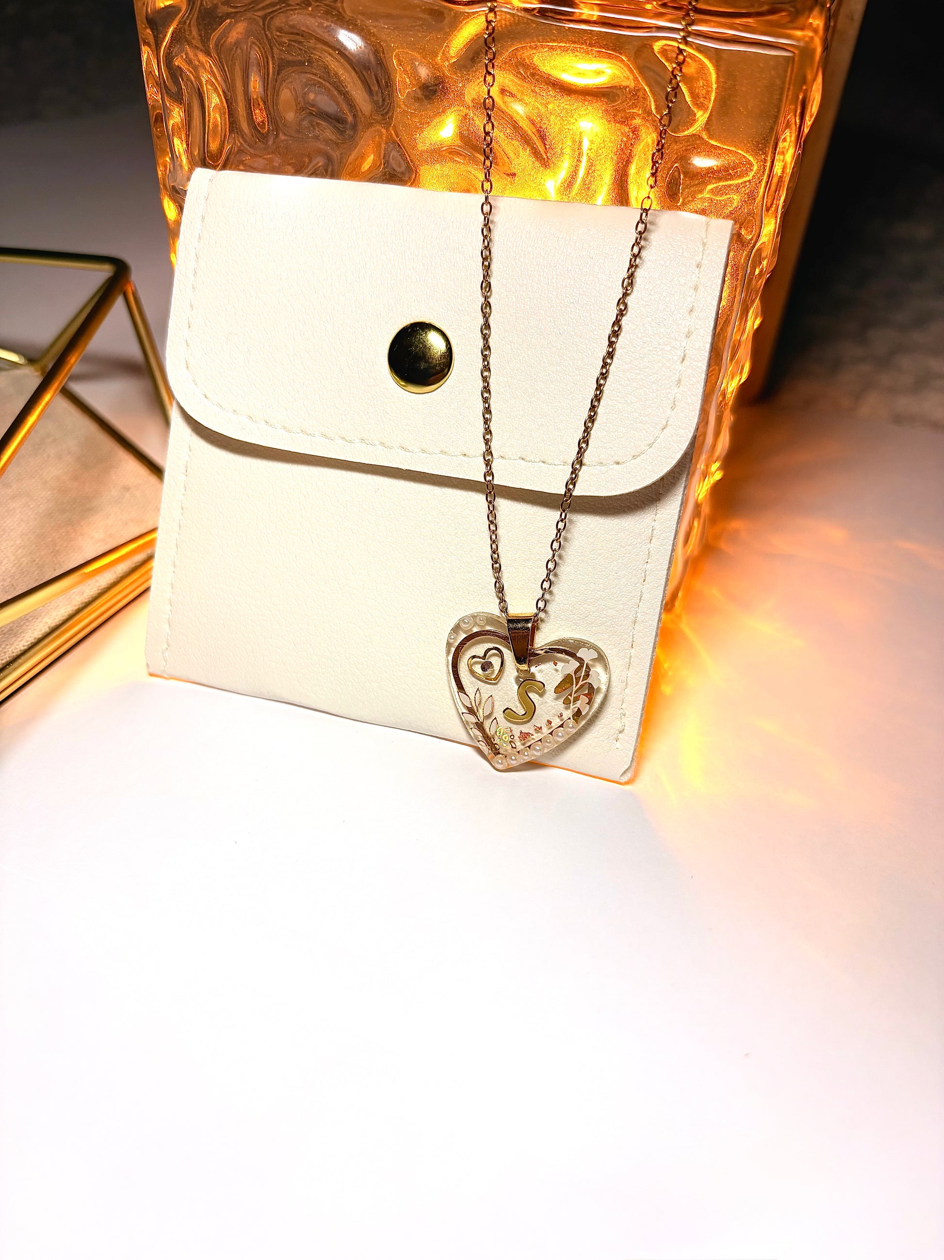 Collier délicat composé d’une chaîne fine dorée et d’un pendentif cœur translucide, orné d’une initiale dorée et de détails délicats incrustés à la main. Chaque pièce capte la lumière avec douceur, révélant un bijou à la fois raffiné et profondément personnel.