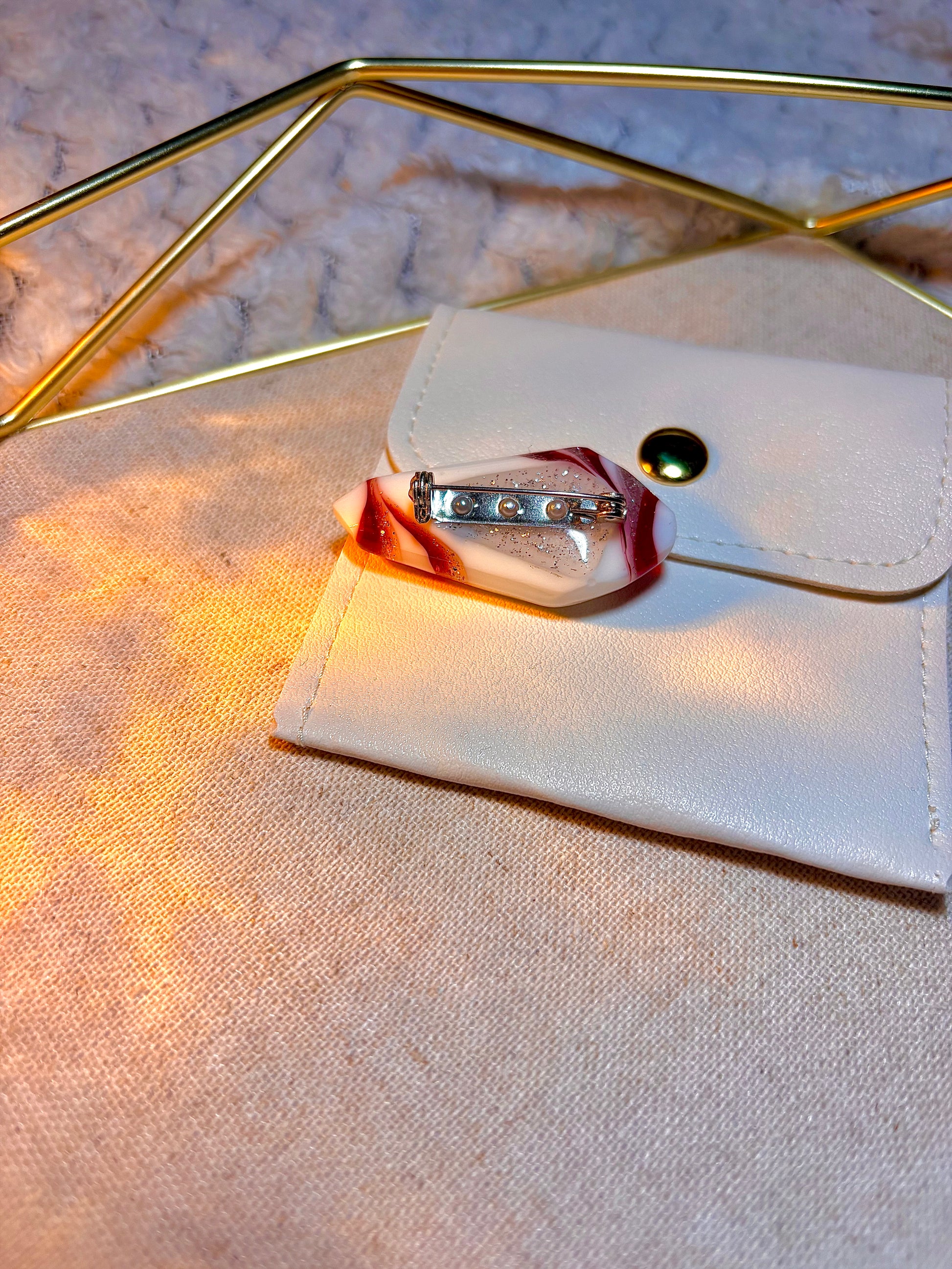 Broche en forme de pierre facettée au design lumineux et délicat. Son effet minéral aux dégradés subtils et ses légères inclusions scintillantes lui donnent un rendu élégant et moderne.